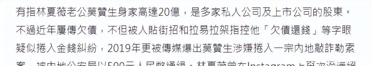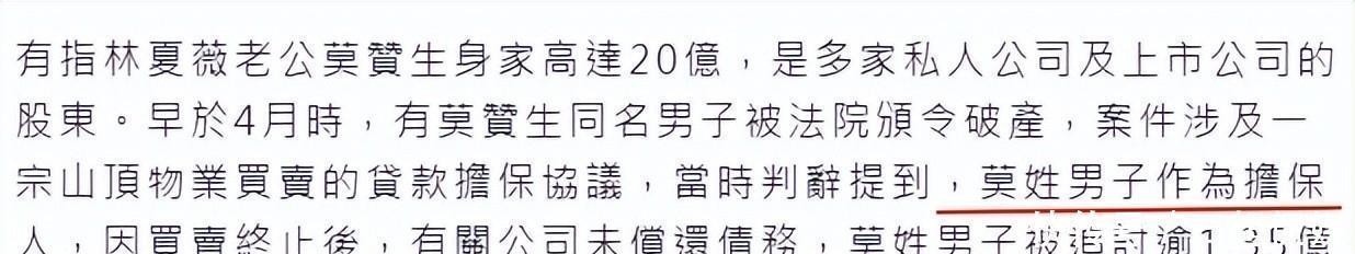当林夏薇酬酢平台晒的15亿山顶豪宅还在发光,"停业"二字几乎像走错片场的群演。吃惯权门恩仇饭的港媒火速扒起旧账——丈夫莫赞生的商界神话早被追债海报糊过墙。2015年那份赏格通缉的内地外传已是过时弹药,可本年四月曝光的"同名停业案"炸药味彻底:某莫姓商东谈主用物业担保的过亿债务崩盘奥斯卡赔率,债权东谈主正提刀追斩。蛛丝马迹被显微镜聚焦:"担保的该不会是良伴名下物业?"